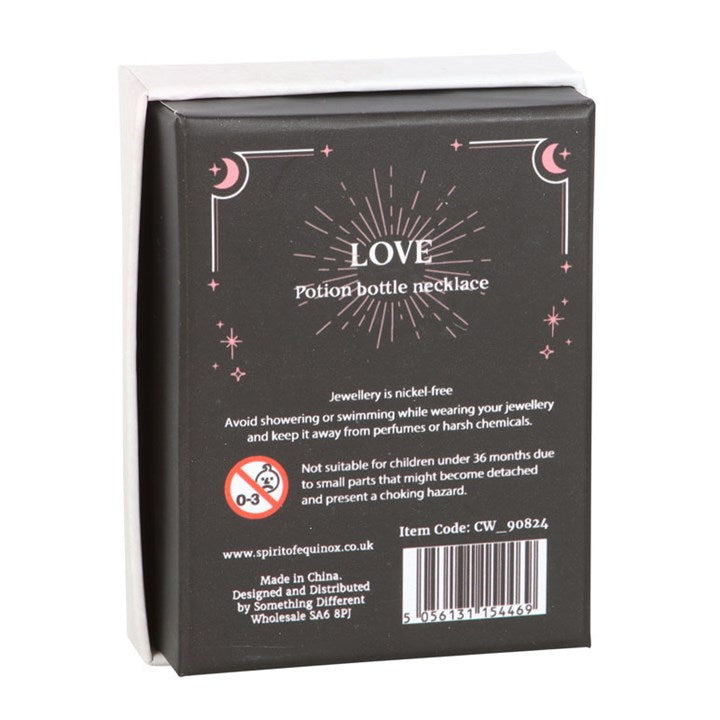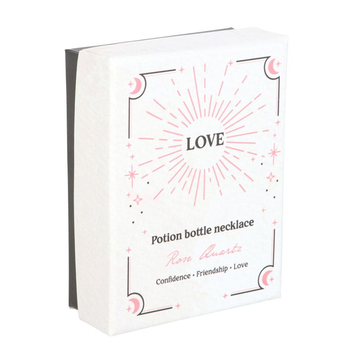 Give the gift of crystal magic with this miniature potion bottle necklace. With natural rose quartz crystal chips and a cork stopper, this necklace serves as a spellbinding accessory while attracting love, friendship and confidence. Presented in a matching gift box and perfect for that special witch in your life. Plastic bottle on a nickel-free stainless steel chain.